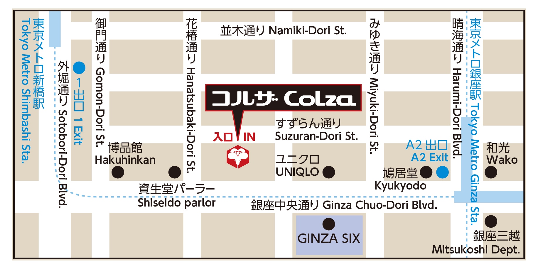 From Exit A2 of Tokyo Metro Ginza Station, proceed along Chuo-dori towards Shinbashi and turn right at the Ginza 6-chome intersection. Turn left at the first corner of Suzuran Street, and the building entrance will be on your left.